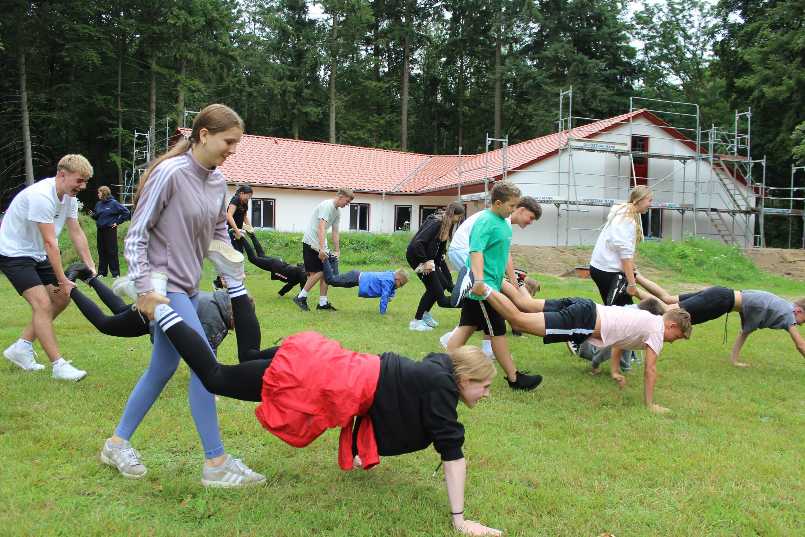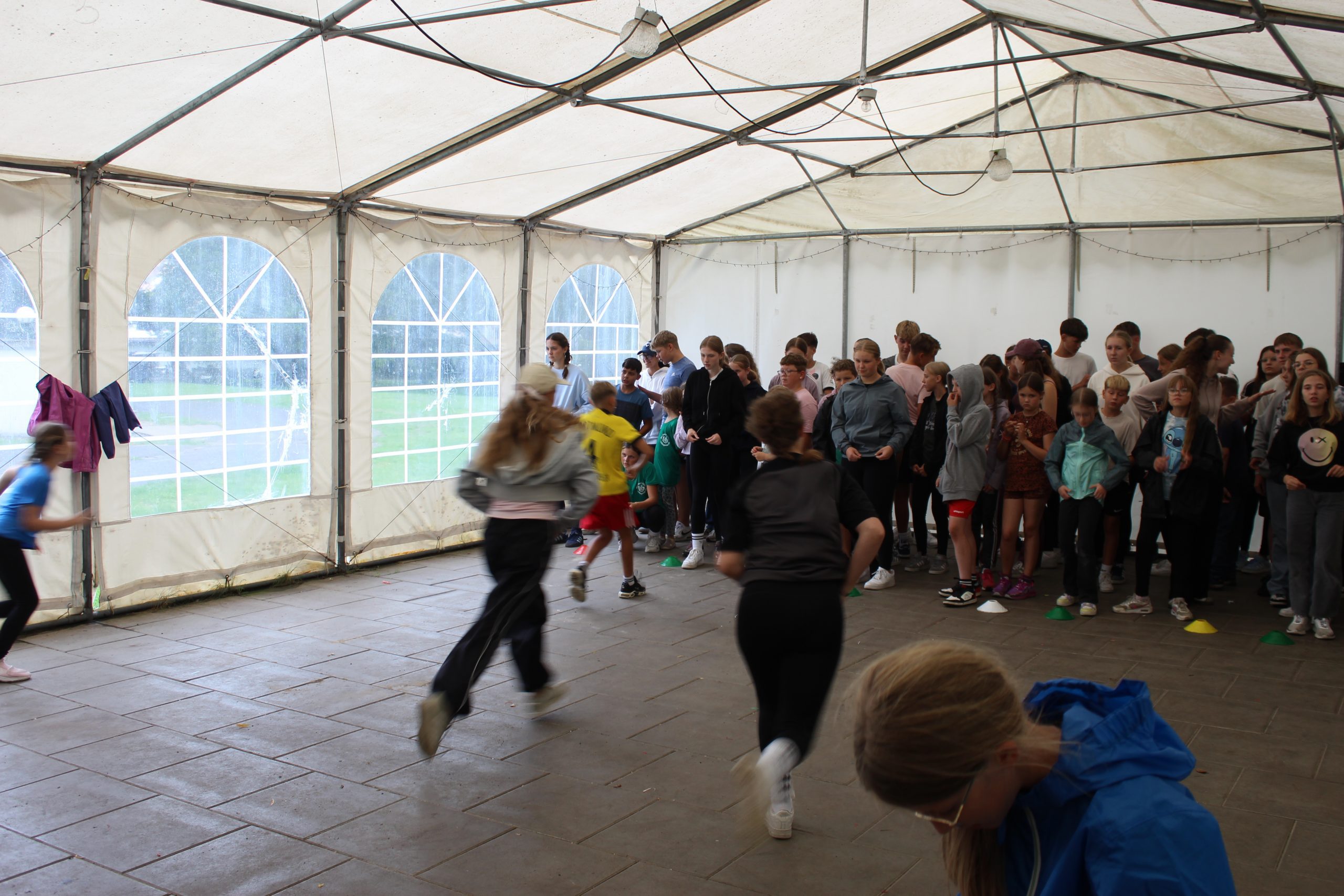 Nach dem Mittagessen und einer kurzen, kontemplativen Freizeit – in der überwiegend die regulären Dienste erledigt wurden (Klodienst, Tischdienst, Spüldienst, Kehr- und Außendienst sowie das schriftliche Festhalten im Tagebuch) – ging es mit den Staffelspielen weiter. Zunächst unter freiem Himmel angesetzt, wurden diese bei beginnendem Schauer wohlüberlegt in unser Outdoor-Zelt transferiert. In diesem Abschnitt konnten die Kinder exemplarisch Teamgeist, koordinative Fertigkeiten, kommunikative Kompetenz sowie weitere athletische Dispositionen zur Schau stellen und weiterentwickeln.