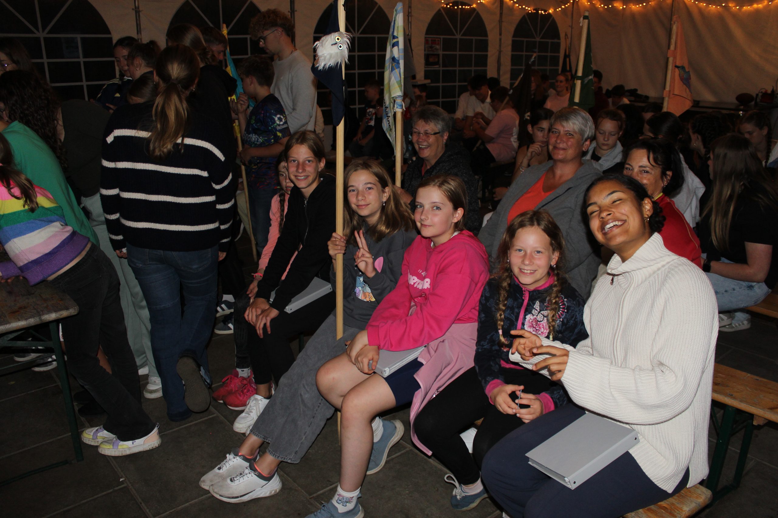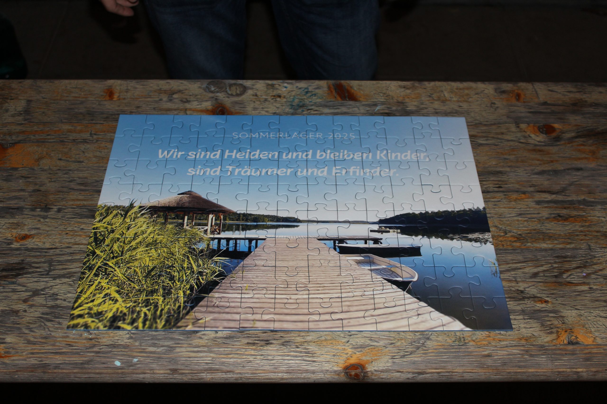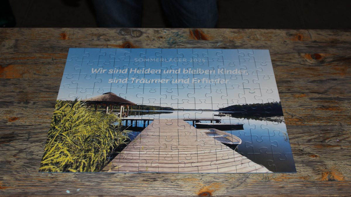Der Abend gestaltete sich dann zurückhaltender, da es Sonntag war: Ein gemeinschaftlich gefeierter Gottesdienst bildete den Mittelpunkt, in dessen Rahmen die Wimpel an die Gruppen übergeben wurden. Abschließend lösten wir gemeinsam ein Puzzle, das das diesjährige Lager-Motto – Wir sind Helden und bleiben Kinder, sind Träumer und Erfinder – sowie ein Bild des Stegs darstellte, an dem wir uns in den kommenden Tagen erfreuen dürfen. Die Älteren (Silberfalken, Flamingos & Waldkäuze) erhielten eine verlängerte Wachzeit und widmeten sich dem Spiel Werwolf, bevor auch für sie das Signal „ab in die Koje“ ertönte, denn der nächste Tag beginnt um 7:00 Uhr für diejenigen, die sich für den Frühsport angemeldet haben.