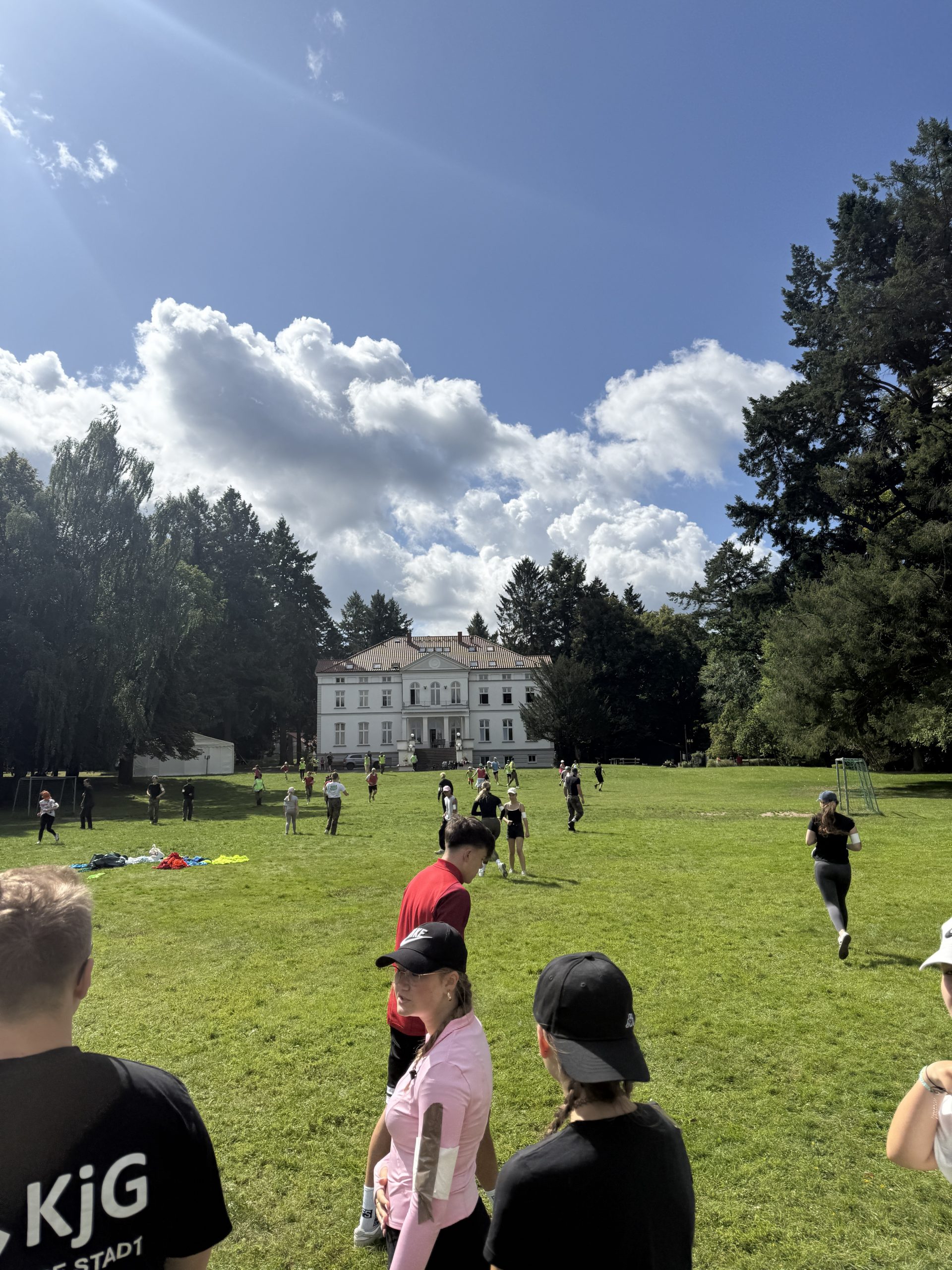 8. August 2025Der Tag begann erfrischend mit einer CTF-Einheit gemeinsam mit der KjG Troisdorf (Stadt), die derzeit ebenfalls ihr Sommerlager im Haus nebenan veranstaltet. Da sie ebenfalls zum Rhein-Sieg-Kreis gehören und Freunde von uns sind, haben wir zunächst die Windhagener Version des Spiels Capture the Flag gespielt ( Beim Spiel CTF – Capture the Flag – geht es darum, die Flagge des gegnerischen Teams zu erobern. Diese befindet sich in der feindlichen Basis und wird idealerweise von einigen Teammitgliedern bewacht. Eure Aufgabe ist es, die Flagge zu stehlen und unversehrt in eure eigene Basis zu bringen, ohne selbst gefangen zu werden oder die Flagge zu verlieren. Gelingt euch das, erhält euer Team einen Punkt). Dabei wurden alle Teilnehmer:innen gemischt und in vier Teams aufgeteilt. In der zweiten Runde testeten wir dann die Variante der KjG Troisdorf – auch hier hatten wir sehr viel Spaß. Gespielt wurde auf unserem eigenen Gelände, das deutlich größer ist.