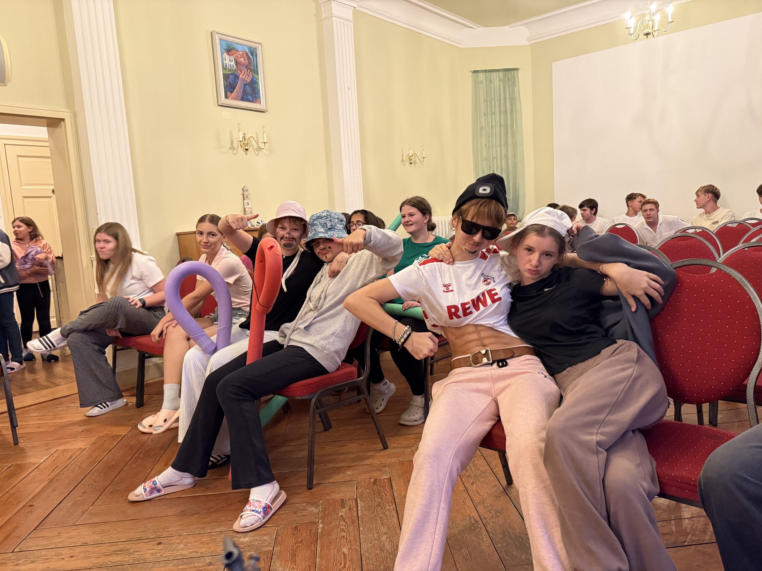Nach dem Essen ging es wegen des etwas wechselhaften Wetters weiter mit einem Indoor-Programm. Im Schloss hatten wir überall Escape Rooms aufgebaut, die die Kinder in einer vorgegebenen Zeit lösen mussten. Dabei lernten sie unterschiedlichste Fähigkeiten und befreiten sich erfolgreich aus allen Räumen. Zum Abschluss folgte das Impro-Theater: In kleinen Gruppen bekamen die Kinder Wörter, Räume und Musik vorgegeben und kreierten daraus jeweils einen kurzen, aber feinen Sketch. Sogar die „Aasgeier“ lieferten eine beeindruckende Performance. Wie man weiß, vergeht die Zeit beim Spaß viel schneller, und ehe wir uns versahen, war es schon Zeit für den Impuls. Müde, aber glücklich gingen wir alle ins Bett – nach diesem schönen und ereignisreichen Tag. Denn morgen geht es für alle Sommerlager-Teilnehmer:innen aufs Wasser.