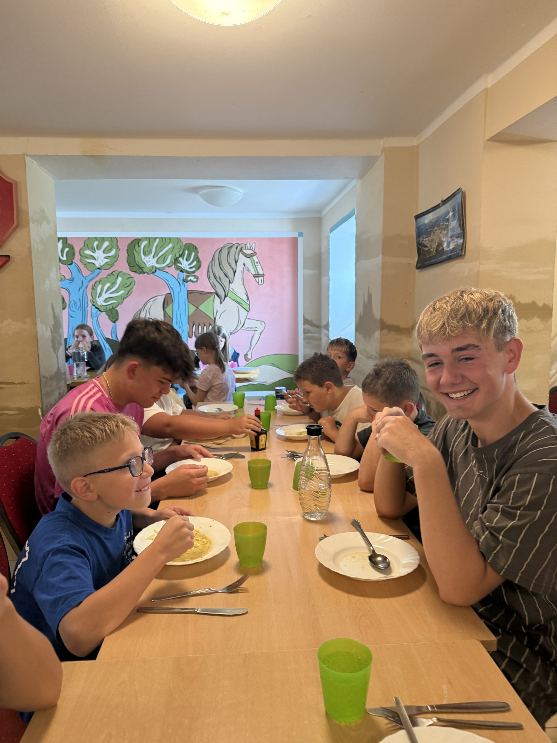 Als Nachmittagsprogramm wählten die Kinder einen mittlerweile schon als Sommerlagerklassiker bekannten Programmpunkt. Wir spielten die KjG Live-Aktion Version des Spiels Siedler von Catan auf dem ganzen Außengelände. In dem Spiel treten vier Teams gegeneinander an, um mit verschiedenen Rohstoffen möglichst viele Städte und Gebäude zu errichten. Bei strahlendem Wetter machte der Programmpunkt nochmal mehr Spaß. Gekrönt wurde der Nachmittag noch von einer Schwimmrunde im hauseigenen See.
