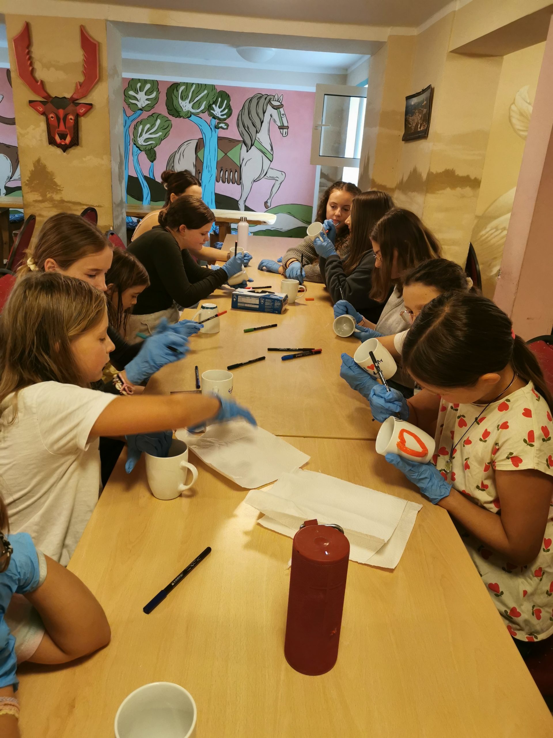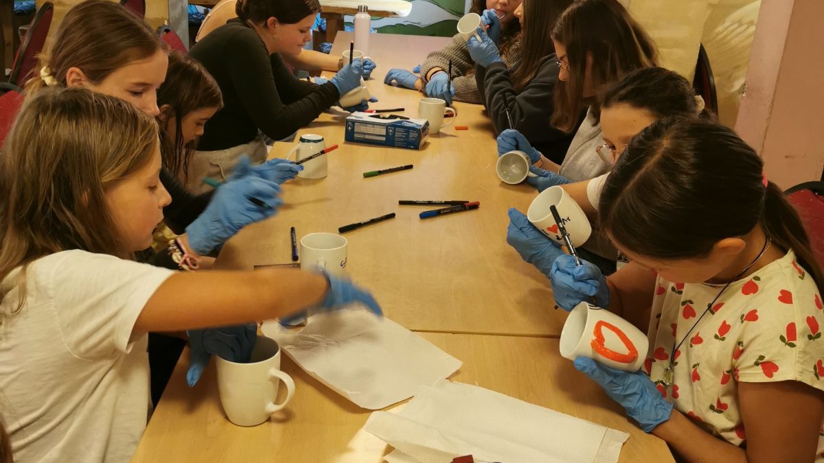 Nach einem stärkenden Frühstück standen Workshops an. Die Kinder durften sich zwischen sechs verschiedenen Aktivitäten entscheiden. In kleinen Gruppen wurden dann Tassen bemalt, gestickt und mit Perlen gebastelt, Volleyball gespielt, gedehnt und meditiert, das Gesellschaftsspiel Werwolf gespielt und im sich im Beautyworkshop entspannt.
